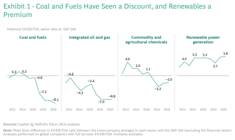 Investor Concerns. Investors, forever motivated by fear and greed, are already pricing climate risks into—and rewarding smart climate moves in—their valuations and behavior. There are many examples across a multitude of industries. In the energy sector, for instance, investors now value profit from coal at a materially different multiple than equivalent profit from renewables. (See Exhibit 1.)