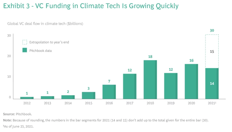 Venture capital firms have poured $86 billion into clean tech over the past ten years and are on track to invest $30 billion in the space in 2021 alone. (See Exhibit 3.) In Q2 of 2021, the average size of Series A deals was double that in the corresponding quarter of the prior year.