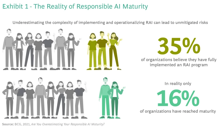 Despite the promise of RAI and the risks of inaction, many organizations have struggled to put RAI principles into practice in a coherent and comprehensive way. And there is a gap between where organizations think they are in their RAI journey and where they really are: 35% of organizations believe they have fully implemented an RAI program, but, in fact, only 16% have reached maturity. (See Exhibit 1.) With the imminent arrival of the European Union’s AI Act, one of the first broad-ranging regulatory frameworks on AI, the failure to successfully implement RAI will have more serious