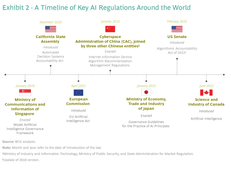To date, more than 60 countries as well as some international organizations have approved voluntary principles and standards to guide AI usage and development. Two prominent ones are the OECD Principles on Artificial Intelligence and the Draft Risk Management Framework by the National Institute of Standards and Technology in the US. (See Exhibit 2.) Formal laws have not yet been forthcoming, however. Widespread government focus is now trying to rectify this situation, driven at least in part by the highly publicized lapses of AI systems and the harms they can create for citizens and society.