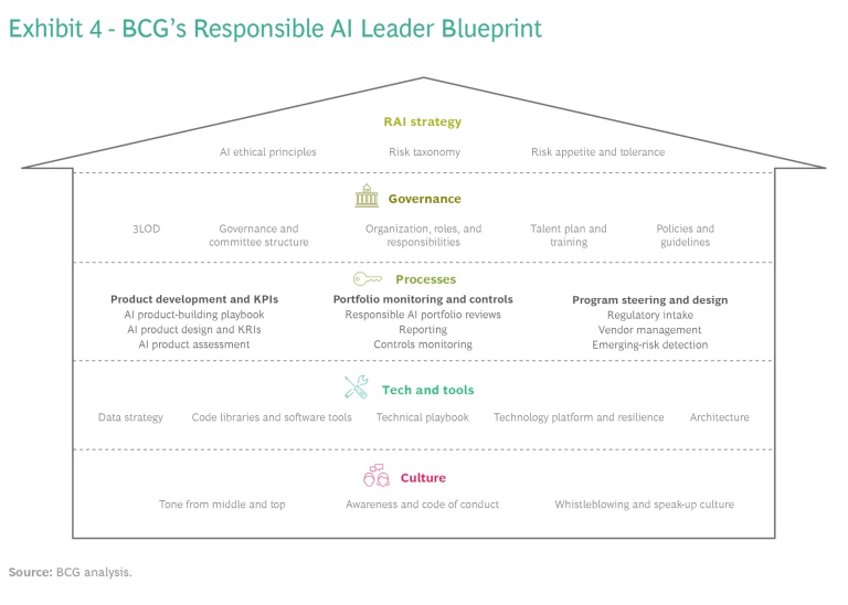 BCG’s holistic Responsible AI Leader Blueprint consists of five dimensions: RAI strategy, governance, processes, tech and tools, and culture. (See Exhibit 4.)