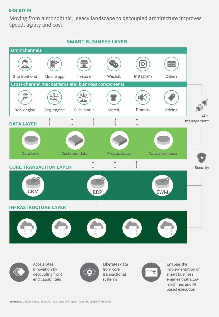 Legacy technology architectures which are inflexible to change. Common challenges include complex legacy architecture with limited documentation, vendor lock-ins for specific software, custom-developed solutions not compatible with off the shelf modules, overall siloed architecture, and limited overarching standards and guidelines. Horizontal, four-layered data and digital platforms leveraging off the shelf products, however, can reduce cost by up to 50% compared to legacy technology.