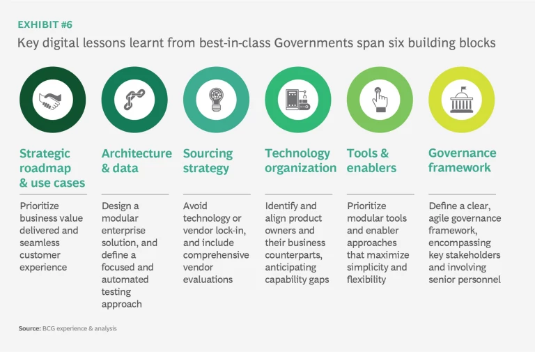 Learning from others’ experiences – particularly what works and what to avoid – will be key to ensuring success. Start with a pragmatic, correctly prioritized, citizen-centered roadmap to focus effort and resources. Embrace modular, not monolithic, technology and data architecture. Optimize your technology organization, adopting an agile mindset and work practices. Create a sourcing strategy that minimizes lock-ins and maximizes your ability to access the right technology, capabilities, and support. Ensure tools and enablers are interoperable. Establish a strong and appropriately flexible governance framework.