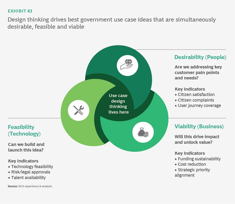 We recommend using design thinking methods to prioritize the right use cases for delivery. The aim is to find the sweet spot at the intersection of what is desirable to citizens, feasible for implementation, and viable from a commercial perspective (Exhibit 3).