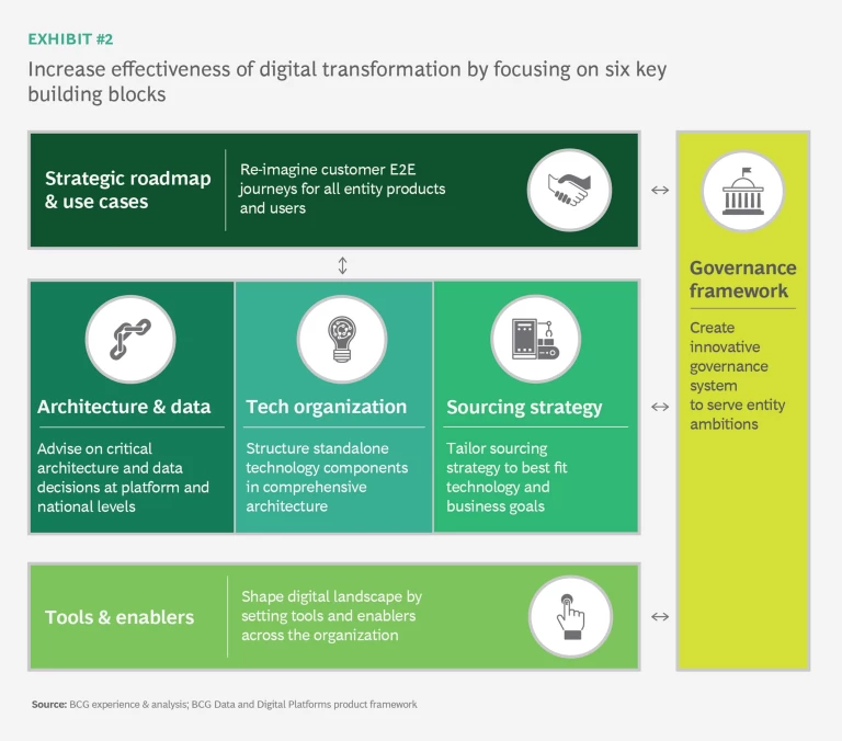 Distilling experience and insights from many client projects, BCG has developed a framework for increasing the effectiveness of digital transformation project execution. There are six key building blocks which work hand-in-hand to secure the success of digital projects (Exhibit 2).
