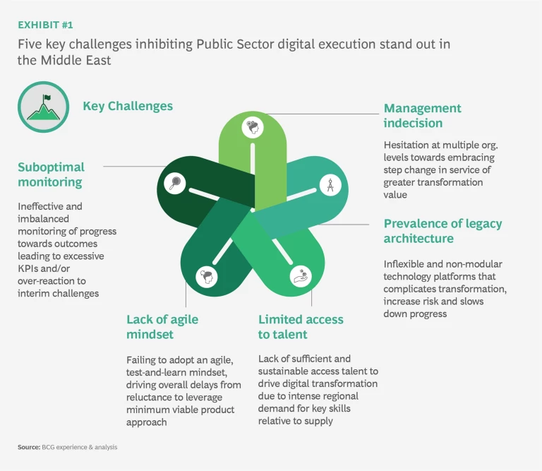 BCG’s extensive public sector digital experience in the Middle East finds that governments confront five common execution challenges, related to management hesitation, legacy technology architecture, a lack of digital talent, failure to adopt an agile mindset, and ineffective monitoring of progress (Exhibit 1).