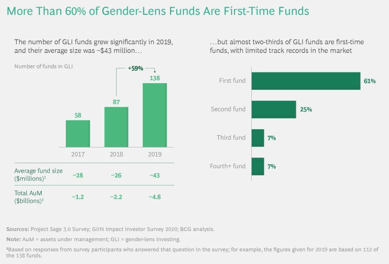 WWB’s two funds have combined assets under management of roughly $125 million, making them among the largest players in the GLI space. But that size falls well below the average funding threshold for institutional investors, denying them access to the biggest pools of capital. Most gender-lens fund managers find themselves in the same bind as WWB. Although GLI has grown in recent years, with the total number of funds more than doubling between 2017 and 2019—from 58 to 138—most of these funds are small and less than one year old, which limits their ability to attract institutional investor capital. (See the exhibit.)