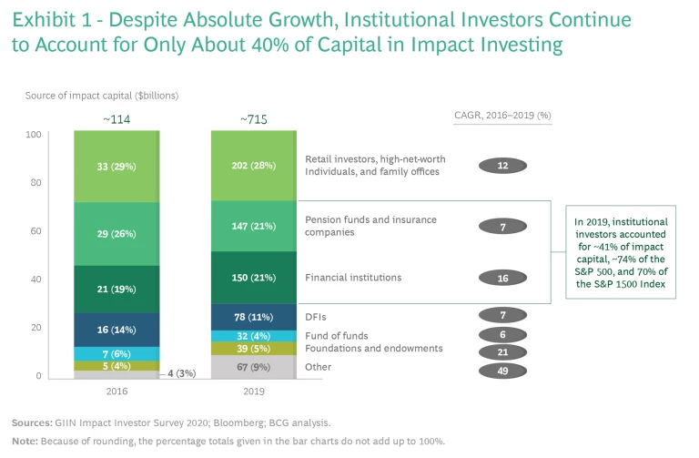 Only institutional investors have the capital resources to effect change at the scale needed. To date, however, their contributions represent a relatively small share of the total impact investing pool—funding that is intended to generate positive, measurable social and environmental impact alongside a financial return. (See Exhibit 1.) And in interviews conducted with a global cadre of institutional investors, we found that many continue to rely more on shareholder activism and saber rattling in the boardroom and less on deploying their capital to force improvements in DEI.