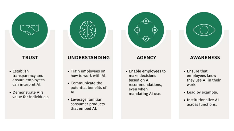 Foster agency. To encourage greater acceptance of AI, managers need to balance mandating AI use and employee agency. It may sound counterintuitive, but requiring the use of AI can overcome resistance and increase adoption; once people start using it, they see the value and willingly continue. However, organizations should not implement AI at the expense of employees’ autonomy. Managers must empower employees to protect their agency.
