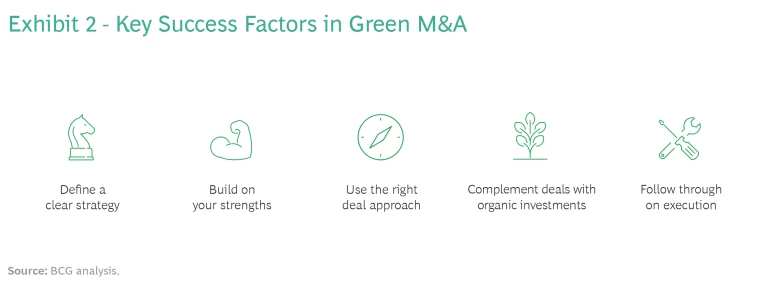 - Define a clear strategy. Pursue green M&A on the basis of an overarching plan informed by a well-considered strategy and thorough portfolio review. Don’t view green M&A as a short-term tactic to greenwash your operations or provide a temporary bump in share price.