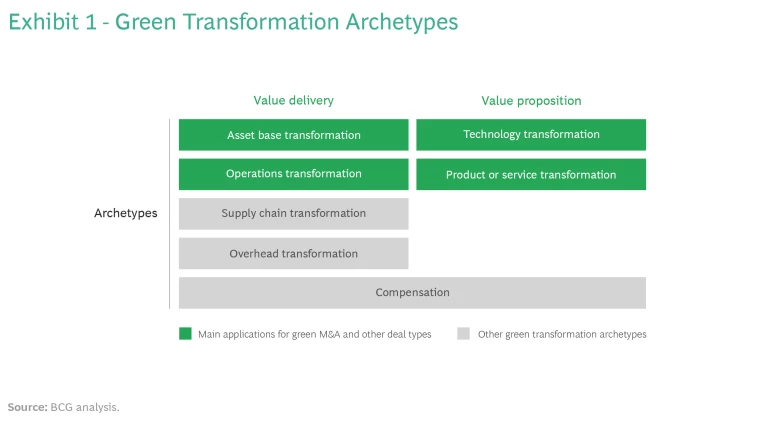 Four environmental transformation archetypes—relating to a company’s asset base, operations, technology, and products and services—are addressable by green M&A or alternative deal structures. Transforming the asset base or operations primarily affects how a company delivers value, whereas transforming technology or products and services alters its value proposition to customers. (See Exhibit 1.)