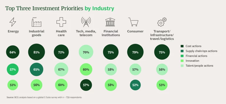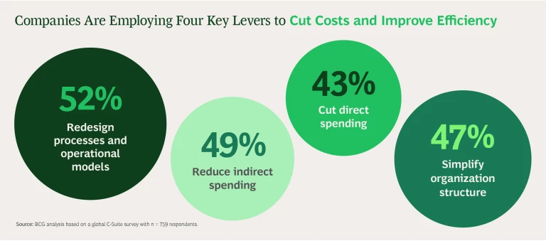 Companies are deploying a combination of strategies to both control costs and create the ability to navigate uncertainty. While 72% of executives globally said they are acting to decrease costs, they are being thoughtful about how they do it. They are placing the highest priority on achieving cost reductions through efficiency improvements, rather than radically slashing direct costs.
