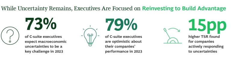 Cost consciousness is clearly top of mind for corporate C-suites as they prepare for what looks to be another year of macroeconomic uncertainty and disruptions. But our research also shows that, even in this challenging environment, corporate leaders know that they must continue to invest to compete and strengthen their resilience. How they choose to deploy their savings in 2023 could well determine which companies emerge as winners when the storm clouds finally pass.