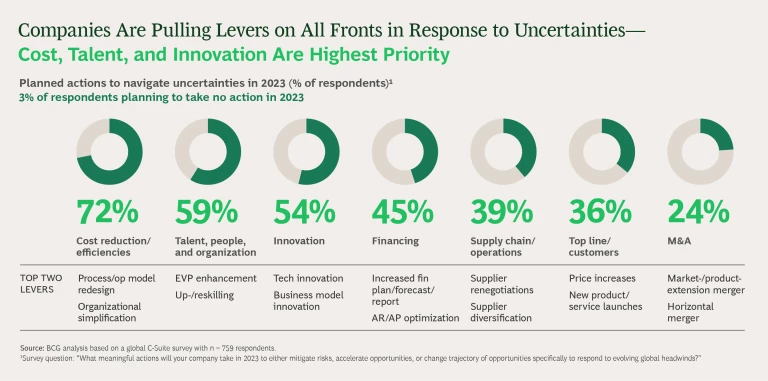 Even though nearly three-quarters of CEOs and other top executives we surveyed indicated that inflation, rising interest rates, and potential recession are top of mind, a surprising 79% expressed confidence in their own companies’ prospects in 2023. And while cost cutting is clearly their priority, most companies are doing so in ways aimed at resetting their organizations for growth and enhancing resilience.