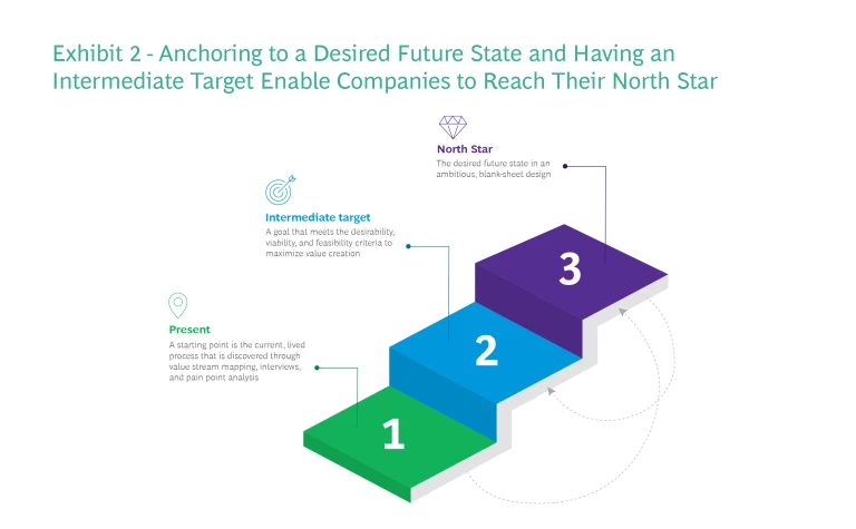 The North Star is organized by value stream and informed by what the value streams must deliver to customers, brokers, and employees so that the company can compete more effectively. It accelerates F2B digitization and allows the organization to set an intermediate target, giving priority to areas where near-term, high-impact wins can help build momentum. (See Exhibit 2.)