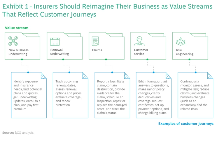 F2B digitization helps commercial insurers begin their transformation by looking beyond their company’s silos and reimagining the business as a small number of outcome- and customer-oriented value streams. (See Exhibit 1.)