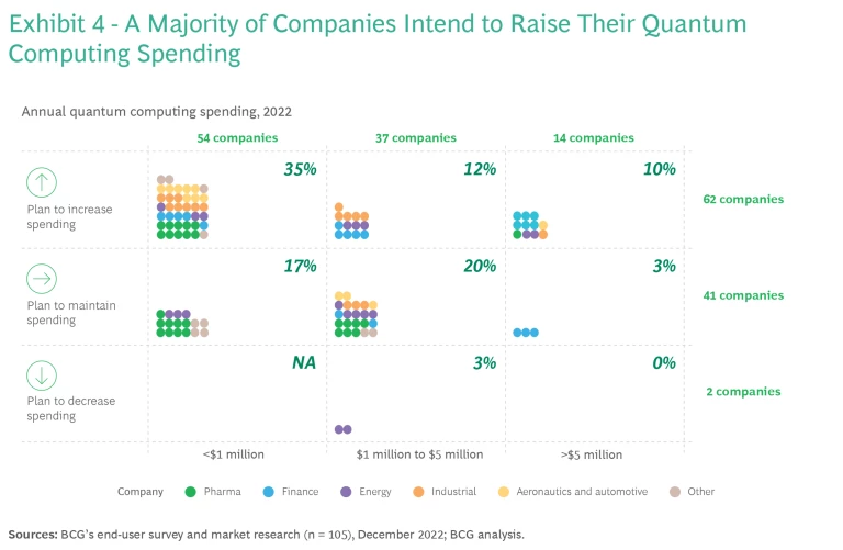 Our survey found limited buyer’s remorse among those investing in quantum computing: nearly all users plan to maintain or increase spending in the coming years. Some aggressive early adopters (those spending $5 million or more annually) are eager to double down and extend their competitive advantage: 80% of these companies plan to increase spending year over year. (See Exhibit 4.)