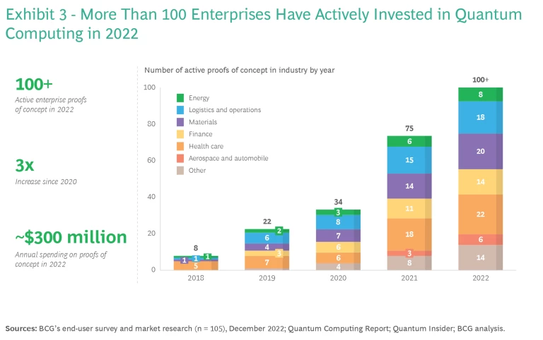 This prospect has venture and corporate investors piling in, identifying use cases, partnering with vendors, and building internal capabilities. Venture capital investing doubled over the past three years to almost $1.6 billion in 2022. Corporate use case activity tripled over the same period with more than 100 enterprise proofs of concept active in 2022 in such industries as automotive, energy, health care, and finance. (See Exhibit 3.)