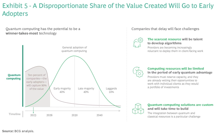 Behind the aggressive posture lies the understanding that, thanks to a confluence of factors, quantum computing in most industries is likely to be a winner-take-most technology, and a disproportionate share of the value created (we estimate as much as 90%) will go to early adopters. (See Exhibit 5.) The key factors that will confound companies trying to play catch-up are: