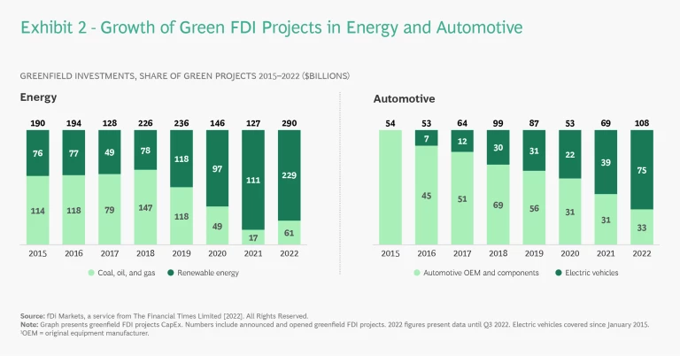 For purposes of our analysis, green FDI means greenfield investments—those that create new assets from scratch in the host country—in renewable energy and related industries; the electric vehicle (EV) value chain; environment-related business services; and recycling. Data limitations prevented inclusion of important sectors such as food and agriculture; mitigation categories such as carbon capture; and projects focused on adaptation and resilience. Still, we believe we have been able to track a majority of the flows that would reasonably be called green FDI. To capture the latest trends, we included announced agreements as well as those where capital has been deployed, using data as of September 30, 2022.