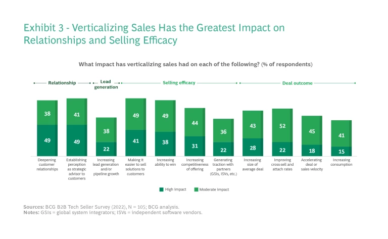 We also heard numerous other examples illustrating that the impact of verticalization spans the entire sales cycle—affecting deal size and deal velocity and creating a competitive edge. While sellers report the most value in deepening customer relationships and bolstering their own credibility, they also find meaningful benefits with respect to selling efficacy and improving deal outcomes such as consumption. (See Exhibit 3.)