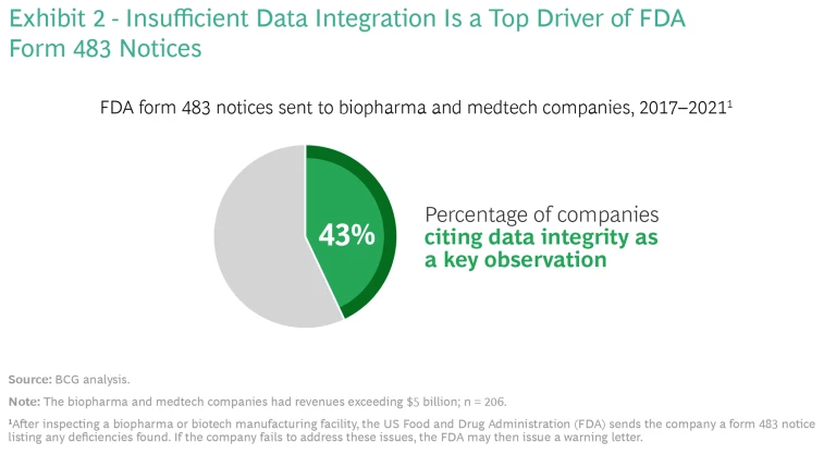 Increasing Regulatory Pressures. Growing regulatory scrutiny has made the need for data integration even more urgent, especially after the implementation of the Sentinel System, an FDA surveillance platform that monitors medical product safety. According to our analysis, data integrity was a key reason for the FDA’s issuance of form 483 notices from 2017 to 2021: 43% of the notices sent to large biopharma and medtech companies (those with revenues exceeding $5 billion) cited data integrity as an issue. (See Exhibit 2.)