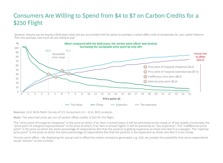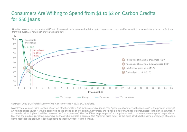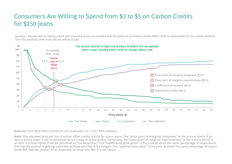 With the full survey panel, our analysis looked at consumer-pricing preferences for three different products—an everyday fashion item ($50 jeans), luxury item ($250 jeans), and travel service ($250 flight). We also provided respondents with the estimated cost to offset the carbon generated by each of the products with high-quality credits. We used the following assumptions regarding the price per ton of carbon credits: $50 for the inexpensive jeans, $100 for the expensive jeans, and $50 for the flight.