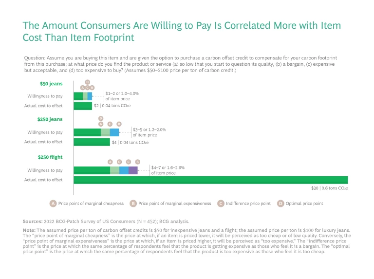 When we looked at the representative sample of 503 respondents, for instance, we saw that the average stated willingness to pay for carbon credits was largely proportionate to the actual cost to offset emissions for the jeans (up to 4% of the total cost). But for an airline flight, which had a much higher proportionate cost to offset its emissions (about 12% of the total product price), the stated consumer willingness to pay—although higher than for the jeans—was still well below the cost to offset. Clearly, some categories present more promising opportunities for consumer offsetting than others.