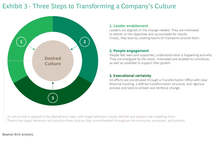 Regardless of the strategy, structure or organization model automakers choose, the EV transformation will require a massive shift in culture, behavior, and people engagement. None of these changes will happen by magic. Given that only one in four transformations succeed over both the short- and long-terms, the odds are stacked against transformation leaders who do not embark on a change journey with a strong plan to deliberately change culture, anticipate and overcome behavioral obstacles, and thoughtfully engage their people. Achieving the desired organization culture requires leader enablement, people engagement, and executional certainty. (See Exhibit 3.)