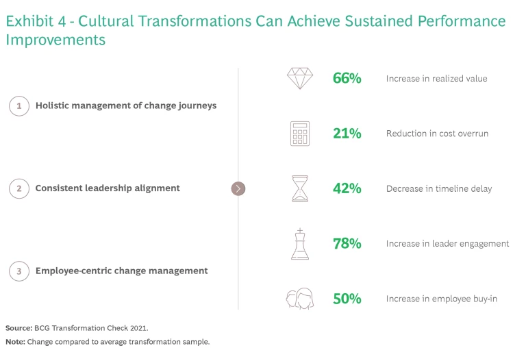 Attention to the human element is a key factor leading to transformation success. As Exhibit 4 shows, employee-centric change management can help improve realized value by 66%, and employee buy-in by 50%, compared to average transformation efforts. (See Exhibit 4.)