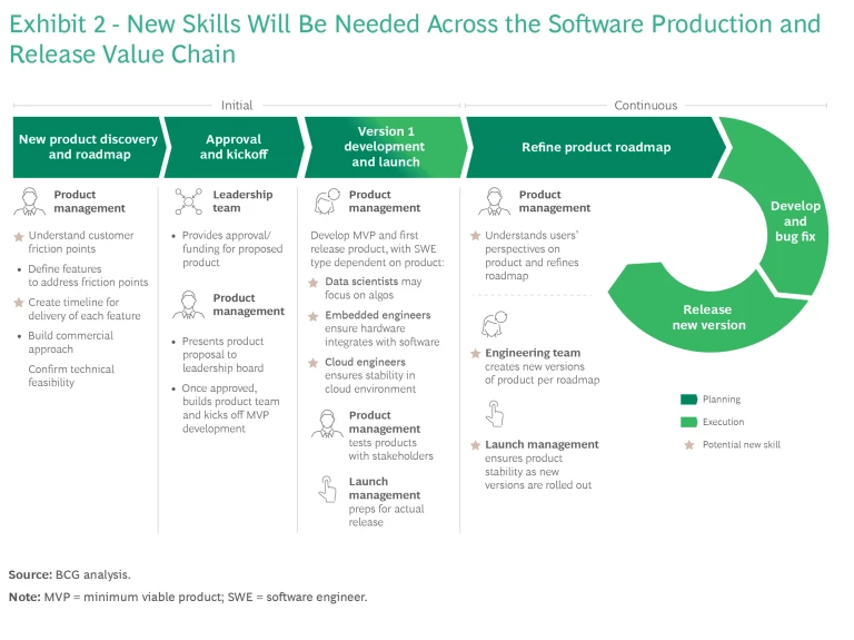 More Multidisciplinary Thinkers. While auto players are catching up on identifying next-generation technical skills, they must also keep up with the paradigm shift from technical expertise to more “T-shaped” skills profiles, with both deep technical expertise and cross-functional skills. For example, engineers will need a strong foundation across physics, data science, programming, machine learning, and AI if they are to innovate across a range of increasingly common integrated components such as ADAS and advanced connectivity systems. Exhibit 2 illustrates many of the new customer-centric, data engineering, and design skills needed throughout the product lifecycle.