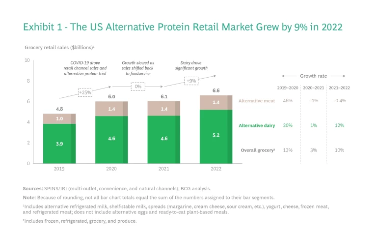 Across alternative dairy (which includes alternatives to milk and other dairy products such as cheese and yogurt) and alternative meat (which includes frozen and refrigerated alternatives to meats such as burgers and sausages), US retail sales grew by 9% in