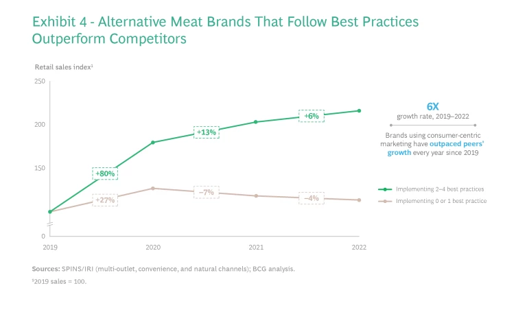 These rates of implementation tell us that alternative meat brands can make several near-term changes to help their products better resonate with consumers. Indeed, the growth rate since 2019 of alternative meat brands that have implemented at least two of the four principles is six times that of their peers. (See Exhibit 4.)