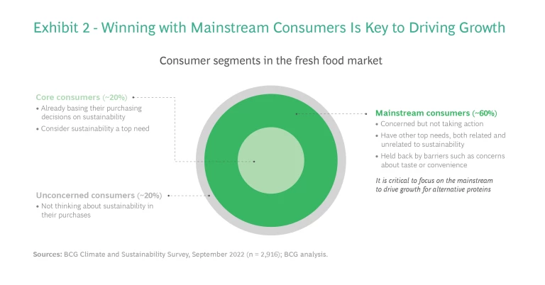 If alternative proteins are to gain traction quickly, companies cannot simply highlight sustainability. Across categories and geographies, we find a substantial “say-do gap”: although most consumers say that they care about sustainability, only a small minority act on it. When making decisions about food, only a core 20% of consumers base their purchasing decisions on sustainability. On the other hand, another 60% of consumers—the mainstream—are concerned about sustainability in the food supply chain but are not yet acting on it. (See Exhibit 2.) For these consumers, other needs influence food purchasing decisions.