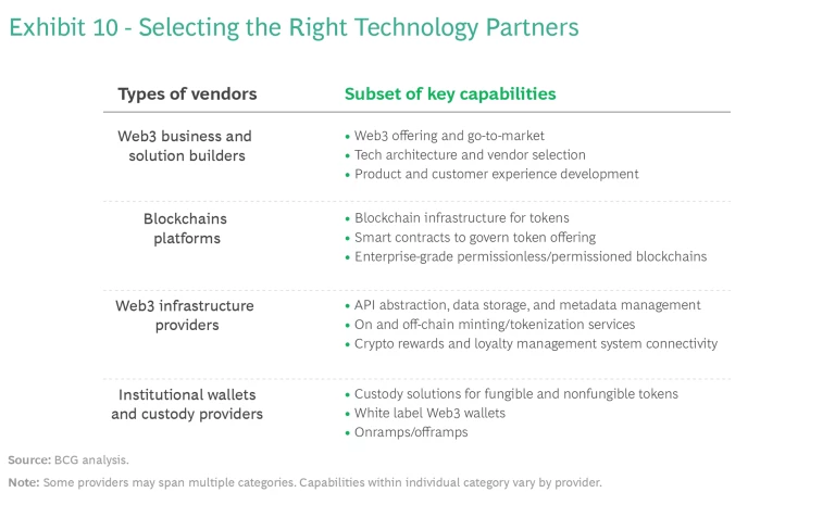 Technology Partners. Navigating the Web3 technology landscape is no straightforward feat. Specifications vary by blockchain platform and Web3 infrastructure players are emerging that are trying to address the complexity through APIs and SDKs. (See Exhibit 10.) As a starting point, companies must make four considerations: