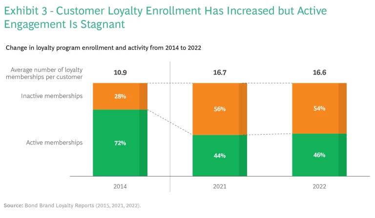 However, the answer is not always as simple as launching yet another loyalty program into an inundated market. Customers are enrolled in more programs than ever before; US consumers held upwards of 16 loyalty memberships on average in 2022, according to Bond’s Brand Loyalty Report. The activity across these memberships can be underwhelming, though; active customer loyalty engagement has been stagnant at below 50% of enrolled programs in recent years. Businesses must understand Web3 and the various options to boost engagement, because consumers will respond—but only to the right offerings.