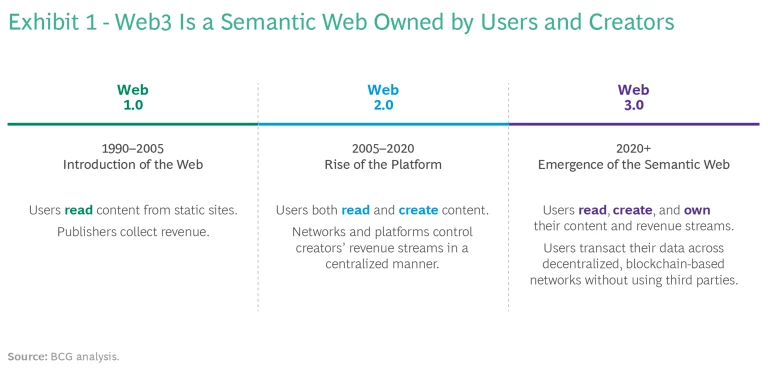 Discussions of Web3 are often clouded by misunderstandings and hype, so it is helpful to clarify how this new technology follows past versions of the internet. Web3 brings together emerging technologies—blockchain most foundational among them—to offer users more control over their activity and interactions. Web 1.0, which lasted from roughly 1990 to 2005, supported the information economy, where publishers controlled content and collected revenue and users consumed the content. Web 2.0 (2005–2020) was the platform economy, where networks and platforms enabled users to both read and create content. The platforms however still controlled creators’ revenue streams in a centralized manner. (See Exhibit 1.)
