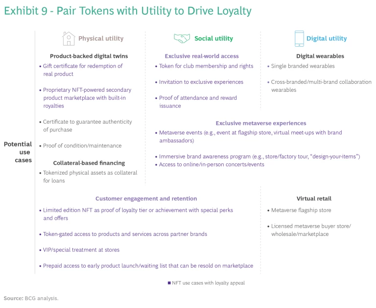 Token Utility. As we outlined earlier, the success of any Web3 loyalty offering will entail pairing utility to issued tokens. The utility spectrum can span physical, social, or pure digital utility. Physical utility involves coupling access to real products and services to the digital asset, such as an NFT that grants access to a redeemable product. Tokens can also have social utility in the form of access to community events, VIP benefits, or exclusive brand voting rights. Digital utility extends privileges and access to the digital world in the form of metaverse events, virtual meetups with brand ambassadors, or in-game use of tokens.