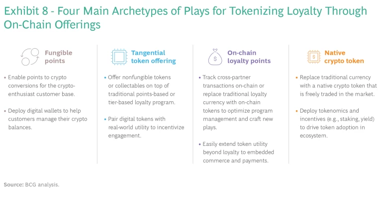 Tokenization Strategy. Institutions must then think through the tokenization strategy they’ll use to deploy, complement, or replace current offerings and help them execute against identified objectives. The options fall along a spectrum of archetypes that vary by technical and regulatory complexity. Careful financial modeling must accompany the chosen archetype to ensure that it achieves desirable financial objectives for the overall loyalty offering. Four archetypes exist (see Exhibit 8):