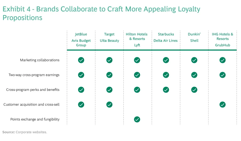 One way that brands can compete at scale is to draw in consumers with propositions involving many partners. Partnerships enable access to more touchpoints with a broader base of customers, more insights, and a wider array of rewards. The numbers are impressive; for example, the Starbucks and Delta Air Lines partnership allows Delta Air Lines to appeal to Starbucks’ 27 million plus loyalty customers—who don’t necessarily all fly Delta Air Lines. Starbucks also gains more touchpoints with their consumers throughout their travel journeys. (See examples of collaborations in Exhibit 4.)