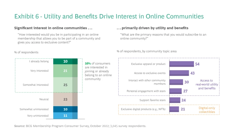 In BCG’s Membership Program Consumer Study conducted in October 2022, the majority of consumers showed interest in being part of an online community or membership, with up to 54% indicating access to utility and real-world benefits as a primary reason to join. Only 21% indicated NFTs or other digital products would be a reason for them joining. This shows the power of bridging digital-only NFTs with real-world benefits to create utility beyond the digital asset itself. (See Exhibit 6.)