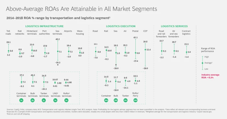 BCG enables you to understand the forces that generate growth and returns and how your own transportation and logistics segments compare with those of the competition. With the data from the Transportation and Logistics Market Insight Tool, you can design a strategy that optimizes your company’s own growth and profits.