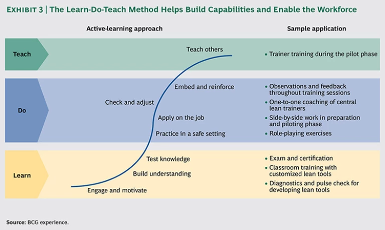 Capability Building. For change efforts to be successful, they need to be centered on people. By capability building, we mean training people to upgrade their skills and capabilities, as well as communicating with them and fully involving them in the change process. Unfortunately, some companies pay lip service to training and capability building, or they design well-meaning programs that are detached from the needs of the business. It is imperative to link capability-building efforts to the daily routines of managing performance, reacting to deviations, taking corrective and preventive action, and continuously improving through both top-down and bottom-up measures. In our client work, we often use a learn-do-teach approach to capability building. (Exhibit 3 shows an example of how BCG uses this framework during a typical project.) When organizations develop the capability to teach the new skills, the change effort becomes replicable. This is the most powerful tool for sustaining change.