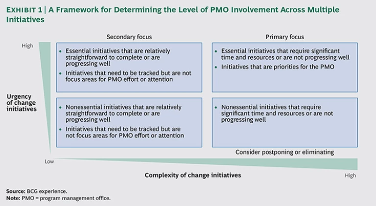 Effective governance is critical. Senior leaders must recognize that in a decentralized company, the various unit heads need different incentives. Unit heads, particularly low-performing ones, may have little reason to change the status quo they have created. Greater rigor and transparency are required to break this deadlock; the company must reward ambition and not tolerate sandbagging. Many companies rely on a PMO to follow up on progress and hold unit heads accountable. PMOs must take an activist role, leading the change but empowering rather than usurping the line. (See Strategic Initiative Management: The PMO Imperative, BCG report, November 2013.) Even if the company does not establish a formal PMO, it needs to ensure that the capability and appropriate support tools are in place to support more complex change initiatives and to track the delivery of benefits. (Exhibit 1 shows a framework for determining the right level of PMO involvement among multiple initiatives.)