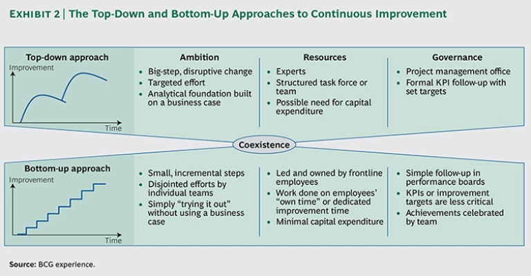 Ideation can take several forms. The top-down methodology uses expert knowledge to find major improvements and step changes in performance. This is beneficial for ensuring an end-to-end, holistic view across multiple sites. The bottom-up approach relies on improvement suggestions from all employees, usually through improvement teams, kaizen events, or employee suggestion systems. Many improvement ideas focus on ergonomics or safety, and managers routinely celebrate successes. This is a very powerful way to make sure that all employees feel empowered to contribute and improve the company’s performance. When successful, such efforts deliver not only improvements but also highly motivated employees. Notably, in our study of lean companies in Japan, where kaizen was pioneered, we found companies in which top-down and bottom-up approaches coexisted in harmony. (See Exhibit 2.)