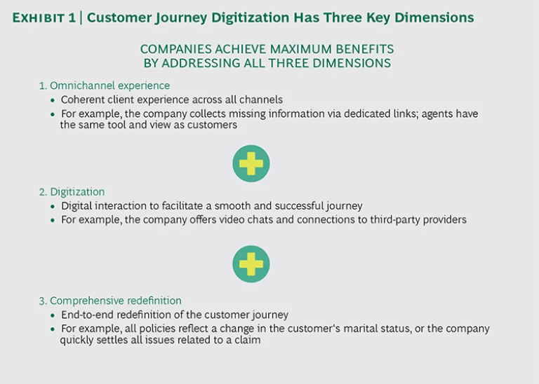 Fully digitizing the customer journey offers insurers multiple benefits. Most important, when it works seamlessly (and invisibly to the customer), the digitized customer journey can lift customer satisfaction levels significantly and can yield cost savings of 15% to 25%. It also increases organizational speed and agility. And it can reduce by up to 40% the number of process loops required to complete a customer journey.