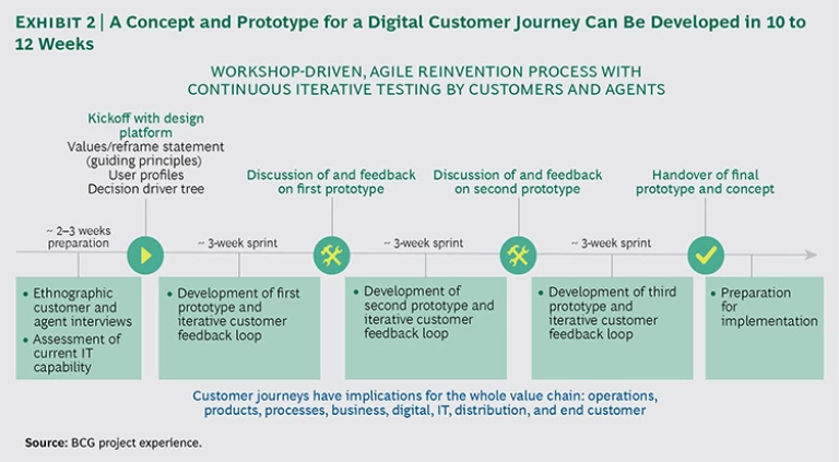 The next step is to develop a digital journey prototype. This involves combining deep ethnographic research into customers’ digital usage and behaviors, and the agile methodology of concept and prototype development. (See “Five Secrets to Scaling Up Agile,” BCG article, February 2016.) Multiple development sprints, interspersed with customer and agent feedback, produce iterations of the target journey prototype that reflect actual customer use. (See Exhibit 2.) By proceeding in this way, the insurer can maintain its focus on user needs. These sprints also help identify which products and processes are easy to digitize and which require a more comprehensive transformation.