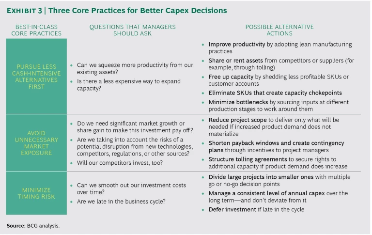 Best-in-class management teams take a consistent and conservative approach to their capex, spreading out the investments over time. In addition, when considering capex decisions, they abide by three core practices. (See Exhibit 3 for a summary of these practices, along with key questions to ask and possible alternative actions to take.)