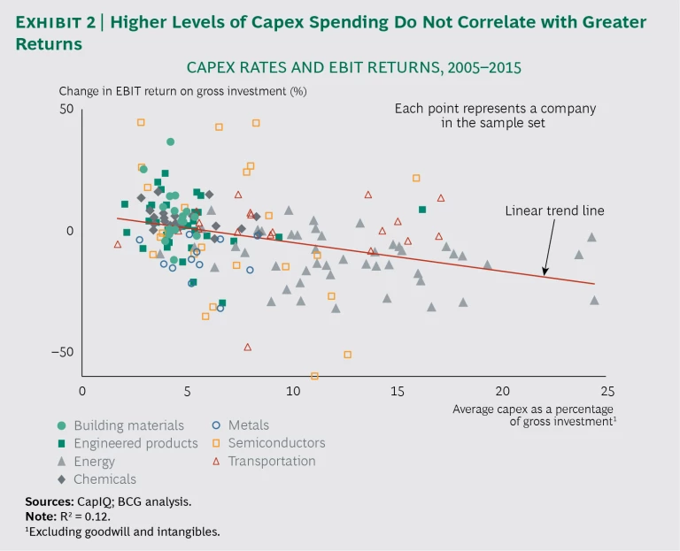 By no means are we suggesting that companies should resist making needed capital investments. Nor are we saying that a company’s success depends on its ability to accurately forecast the business cycle (a near-impossible feat). In industrial goods sectors, large capital investments come with the territory. And as we have said in previous publications, using capex to support long-term growth is a central component of successful corporate strategy. (See “The Art of Capital Allocation,” BCG article, March 2017.) But clearly, many companies are not handling such investments effectively.