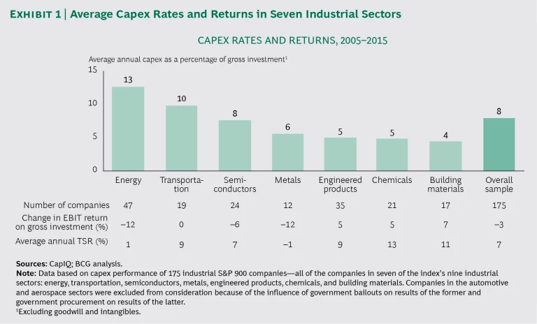We analyzed the capex performance of 175 industrial goods companies in the S&P 900 from 2005 through 2015, a period comprising a full business cycle that included the worst recession in decades. Our study group consisted of every S&P 900 company that fell into any of seven sectors: energy, transportation, semiconductors, metals, engineered products, chemicals, and building materials. (We excluded two industrial goods sectors: automotive, because of the effect of government bailouts on its results, and aerospace, because of the impact of government procurement on its fortunes.) These companies reflected a range of investment rates and results. (See Exhibit 1.) It’s fair to assume that they expected a payoff on their investments in less than ten years. So if they were effective stewards of their capital, the companies that spent more on capex than their peers did should have generated better cash and shareholder returns.